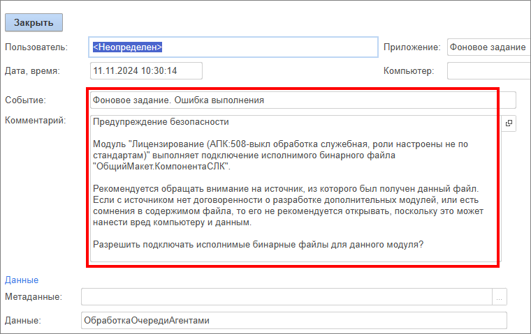 В таком случае в Журнале регистрации появляются ошибки: «Предупреждение безопасности. Разрешить подключать исполнимые бинарные файлы для данного модуля?».
