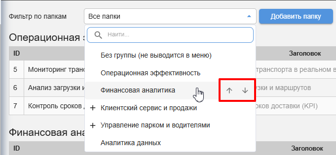 Если необходимо изменить сортировку папок в поле «Фильтр по папкам» (данная сортировка будет и на Главной странице портала), то воспользуйтесь кнопками «Переместить папку выше» и «Переместить папку ниже» рядом с наименованием папки внутри выпадающего списка поля «Фильтр по папкам».