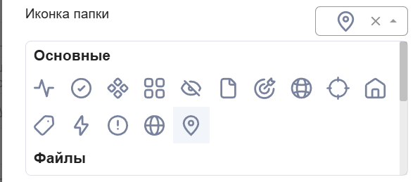- «Иконка папки» — нажмите на область поля, отобразится список доступных иконок для папки. Выберите необходимую папку. Если хотите удалить иконку папки, то нажмите на кнопку со значком крестика. Выбранная иконка будет отображаться рядом с наименованием папки на левом навигационном меню Главной страницы;
