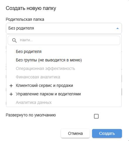 - «Папка» — добавление отчета в папку для отображения на Главной странице. Если выбрать «Без родителя», отчет не будет отображаться на Главное странице. Также в выпадающем списке папок не все папки доступны для выбора, т.к в них уже находятся другие папки.
