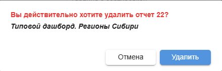 - «Удалить отчет» — при нажатии на кнопку отобразиться предупреждающее сообщение «Вы действительно хотите удалить отчет №<номер отчета>? <наименование отчета>» с кнопками «Отмена» и «Удалить». При нажатии на кнопку «Удалить» отчет удалится, а при нажатии на кнопку «Отмена» — нет.