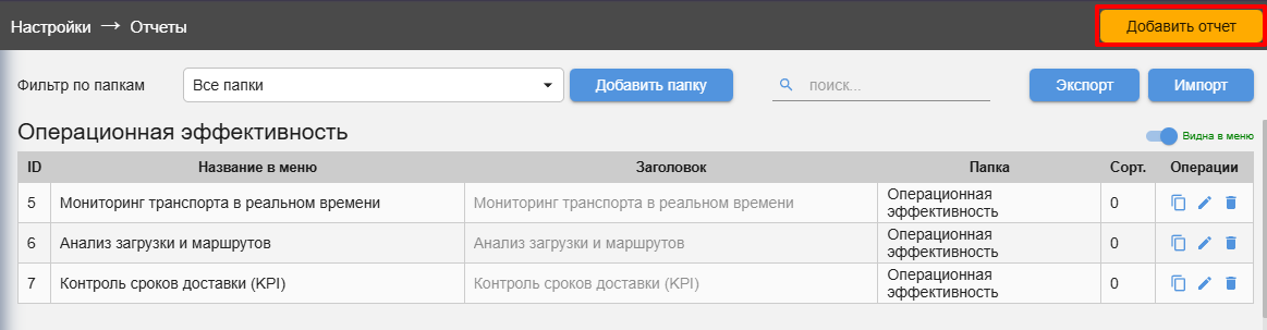 В интерфейсе управления отчетами доступны следующие функции: создание папки, добавление новых отчетов, а также настройка их состава, порядка отображения и параметров.