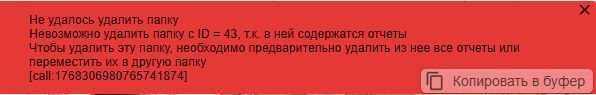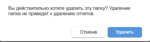Для удаления папки выберите нужную папку в из выпадающего списка «Фильтр по папкам» и нажмите на кнопку «Удалить». Отобразится предупреждающее сообщение «Вы действительно хотите удалить эту папку? Удаление папки не приведет к удалению отчетов» и кнопки «Удалить», «Отмена».
