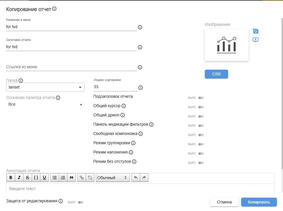 - «Создать копию» — при нажатии на кнопку копируется уже созданный отчет.