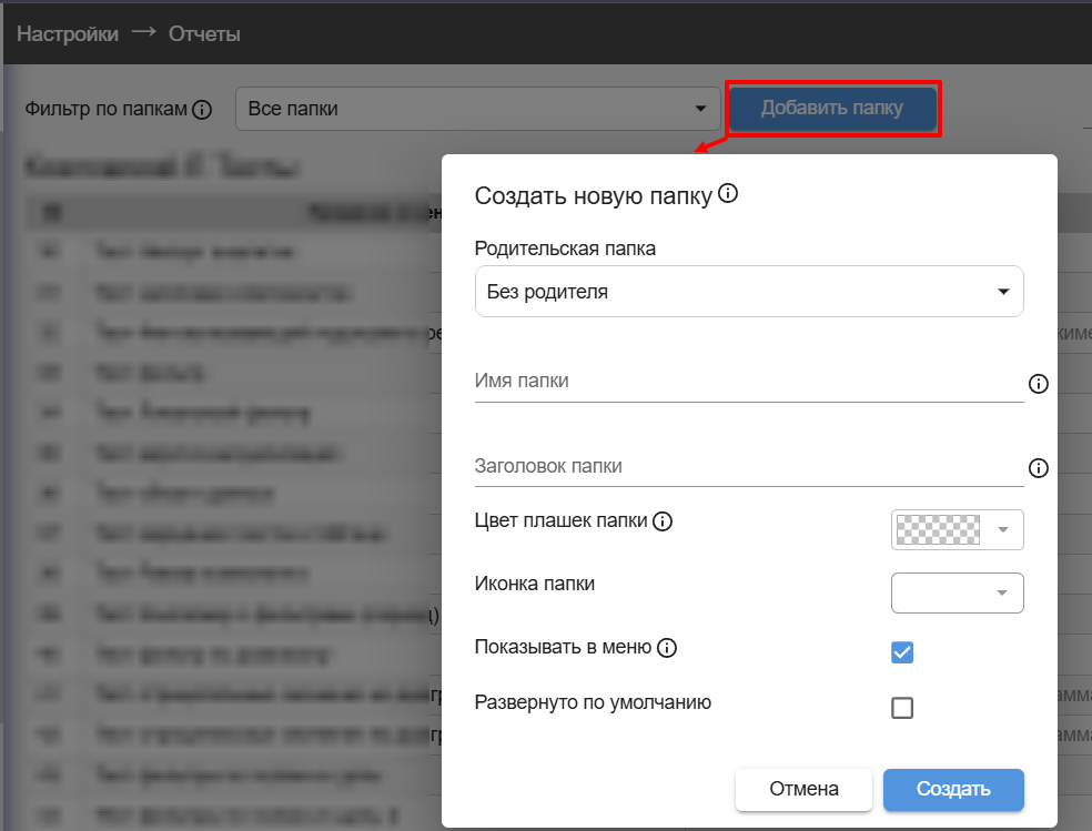 Примечание — некоторые наименования папок в поле «Родительская папка» выделены серым цветом, т.к внутри них содержатся отчеты. Папки и отчеты не могут одновременно располагаться в одной папке, поэтому они недоступны для выбора.