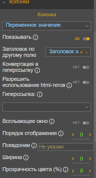 В разделе «Колонки» устанавливаются настройки для каждой колонки. Выберите из списка нужную колонку и установите настройки: