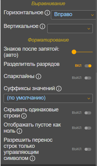- «Суффиксы значений» — поле позволяет добавлять знак % к числовым значениям, при этом не влияя на расчет итоговых результатов. Полезно для визуализации данных, когда необходимо показать относительные значения без изменения исходных расчетов;