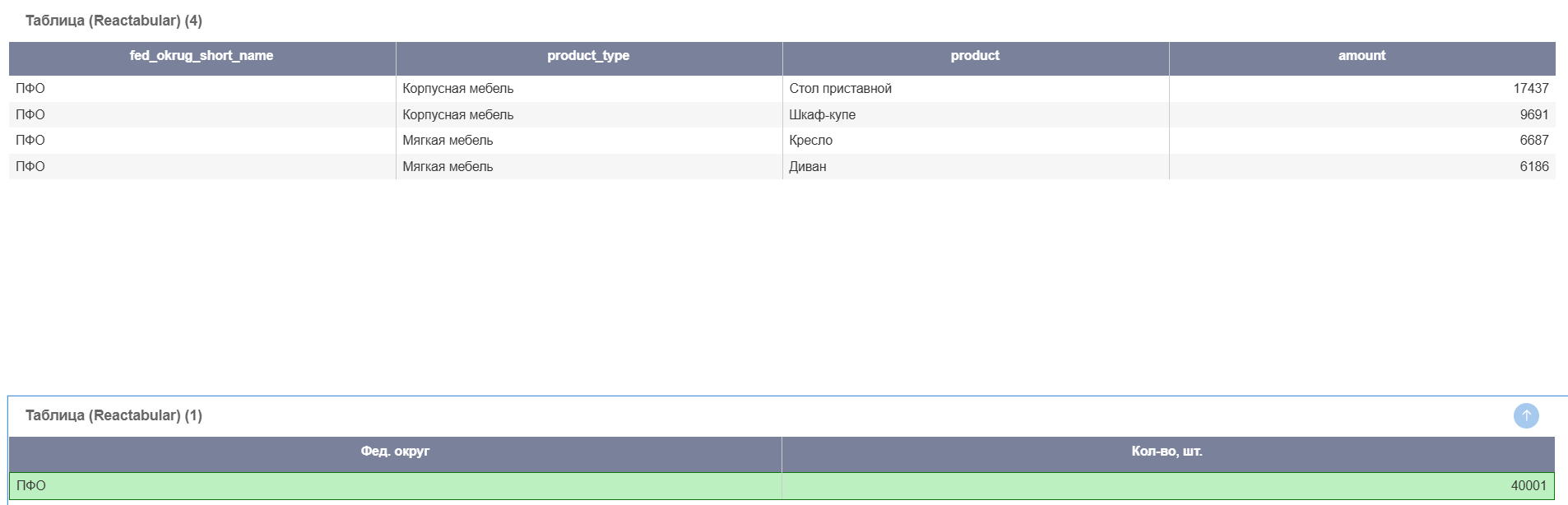 Пример использования: в Таблице на полке Категории размещено поле «ФО» (федеральный округ). При этом на полке Фильтры размещать поле «ФО» необязательно. Когда включен «Режим фильтра», при нажатии на строку со значением Категории = «ЦФО» в отчете подсвечивается строка, на которую нажали. Все остальные строки отображаются в Таблице без изменений, а в отчете ко всем другим компонентам применяется общий фильтр «ФО» = «ЦФО».