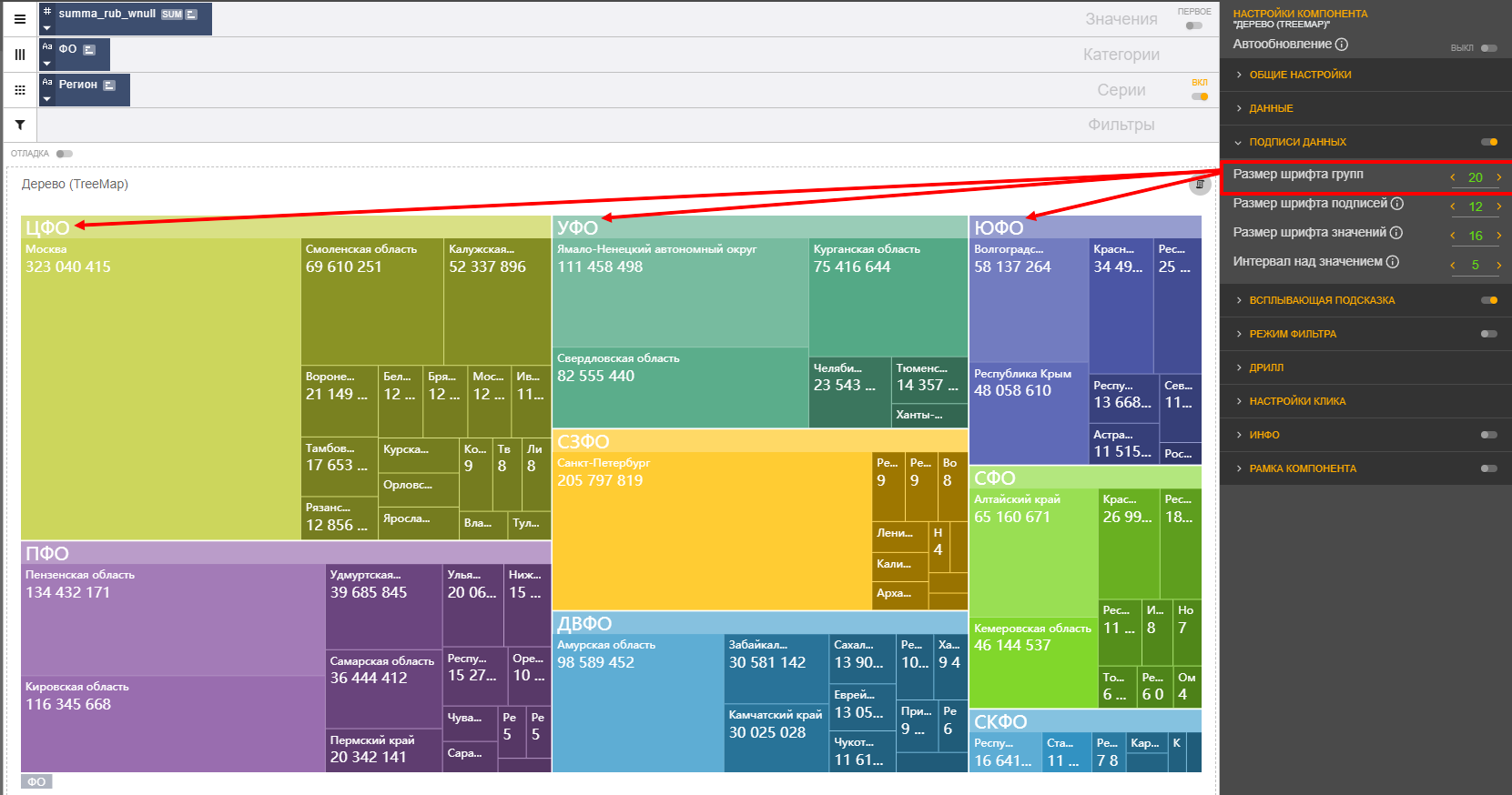 Если в полке Серии располагается пилюля (поле), то отображается дополнительное поле «Размер шрифта групп», настройка которой позволяет регулировать размер шрифта значения поля с полки Серии.