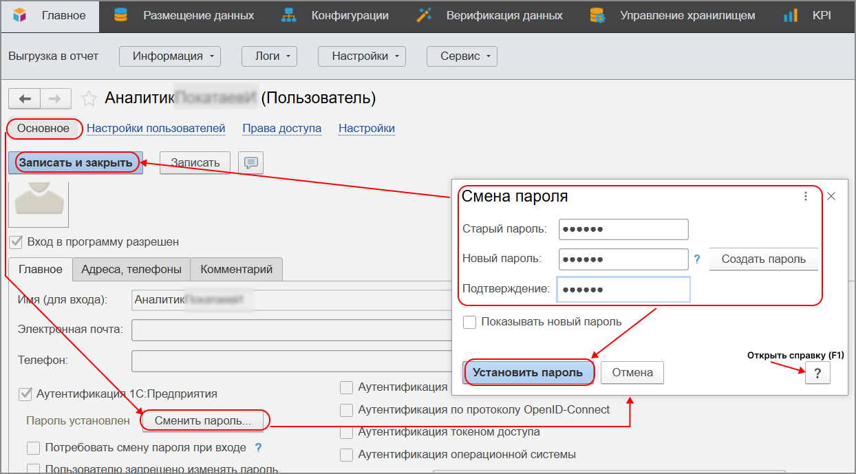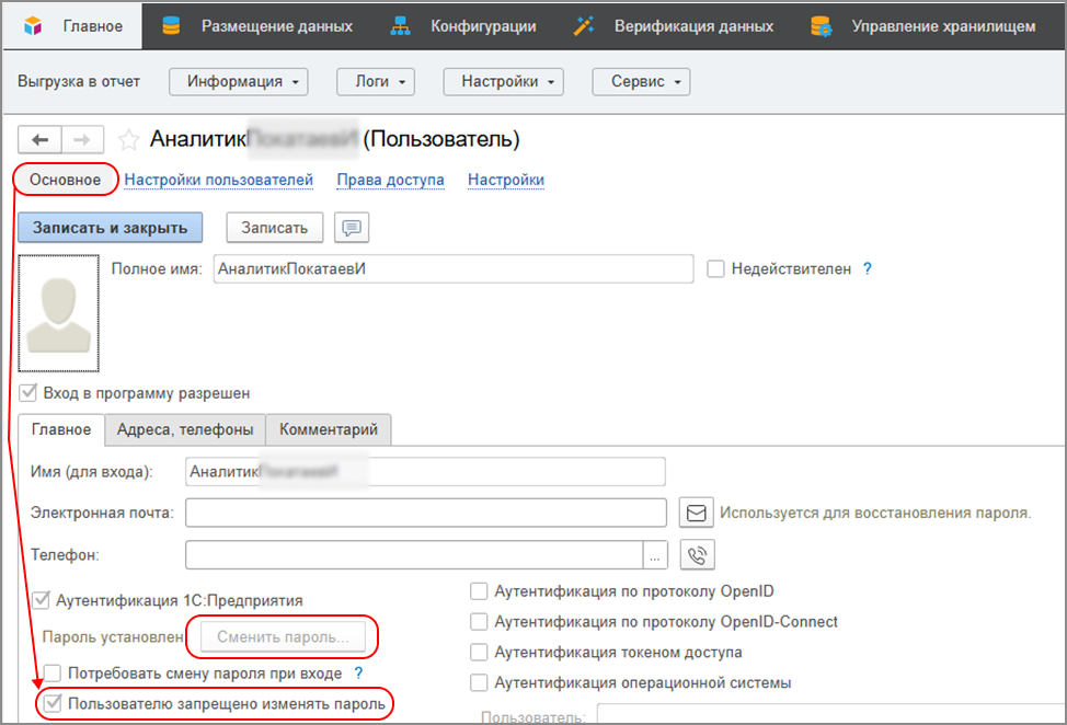 Если у пользователя установлена галочка в поле «Пользователю запрещено изменять пароль», кнопка «Сменить пароль» неактивна, подробнее см. раздел «Настройка профилей и групп пользователей».