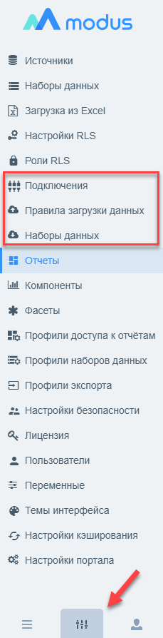 - Ожидаемый результат: на Аналитическом портале в разделе «Настройки» должны появиться дополнительные вкладки, которые позволяют использовать функционал Моделей данных: