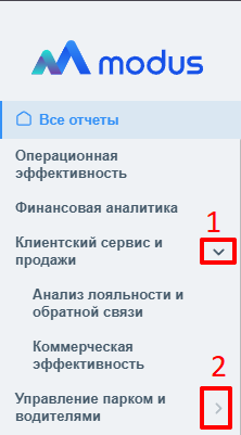 На левой навигационной панели у папок, в которых содержатся дочерние папки, рядом с наименованием отображается кнопка «Развернуть» (1). При нажатии на кнопку происходит разворачивание содержимого папки и на левом навигационном меню отображаются наименования дочерних папок, а также вместо кнопки «Развернуть» отображается кнопка «Свернуть» (2). При нажатии на кнопку «Свернуть» содержимое папки на левом навигационном меню будет скрыто.