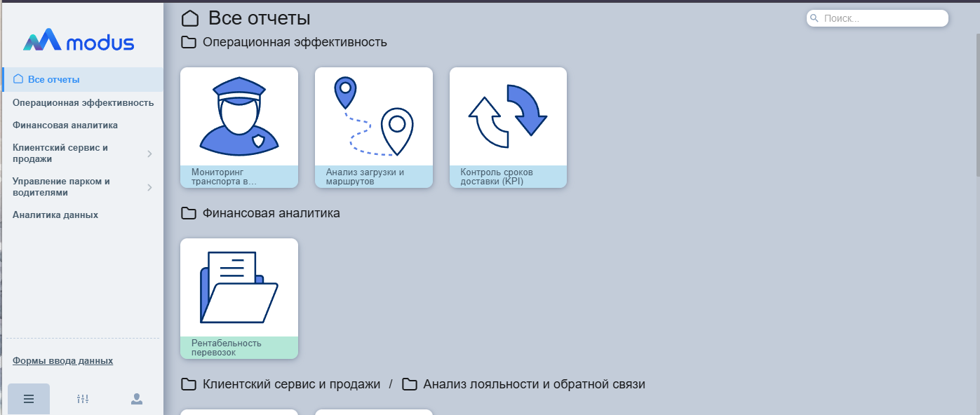 2. Поле поиска. Данное поле позволяет найти необходимый отчет или папку. При переходе в определенную папку поиск будет происходить только внутри выбранной папки. При нажатии на кнопку «Все отчеты» и использовании поля поиска будет происходить поиск по всем папкам.