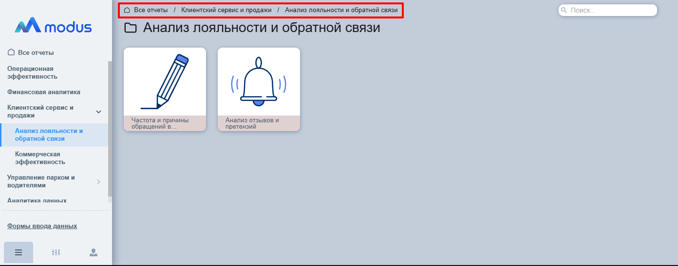 При отображении содержимого выбранной папки отображаются «хлебные крошки»  для визуального понимания положения выбранной папки в общей иерархии папок (например: Все отчеты/ Клиентский сервис и продажи/ Анализ лояльности и обратной связи). «Хлебные крошки» кликабельны и при нажатии на какую-либо часть «хлебных крошек» происходит переход в соответствующую папку.