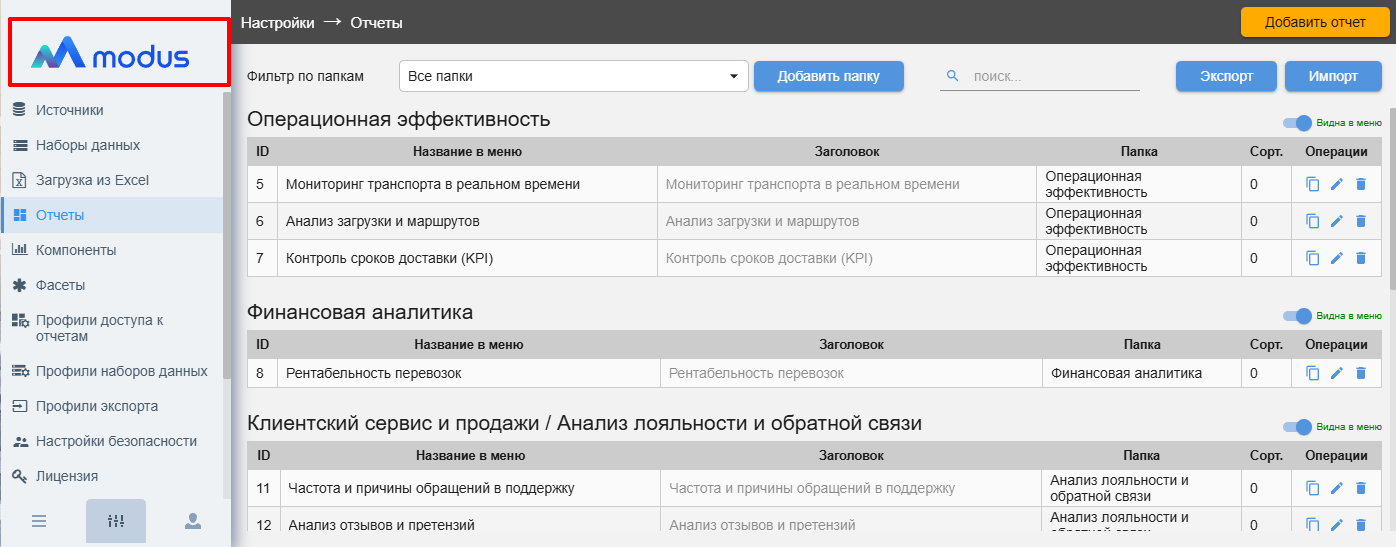 На левой навигационной панели отображается кнопка «Все отчеты», при нажатии на которую отобразятся все отчеты из всех имеющихся папок с указанием «пути» до данных отчетов.