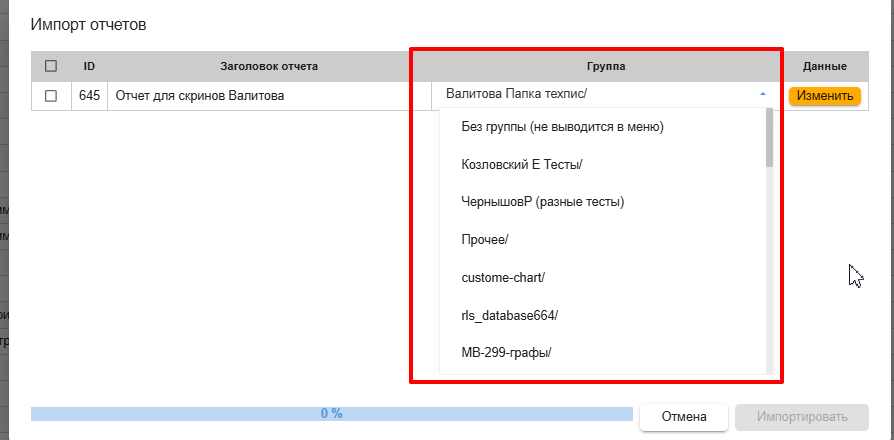 Выберите файл exported_reports.json, полученный в результате экспорта. В открывшемся окне «Импорт отчетов» выберите все или отметьте галочкой только нужные.